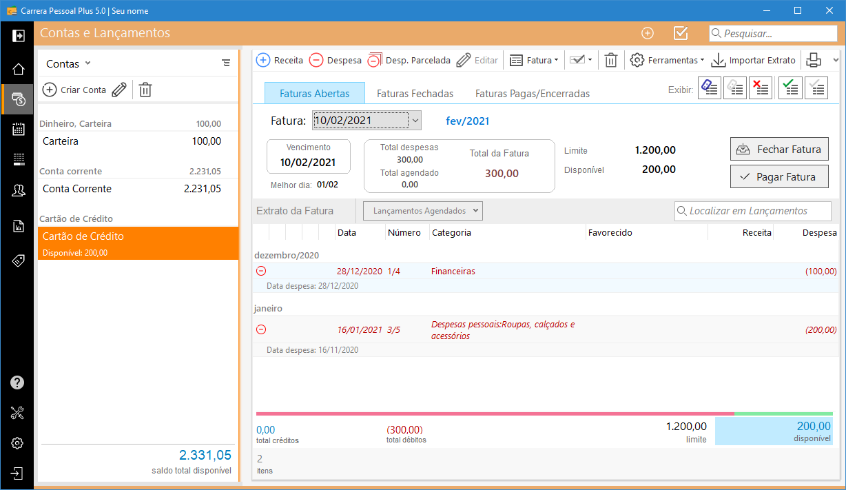 Note que para estas contas a área de lançamentos de contas é alterada, exibindo as faturas do cartão.