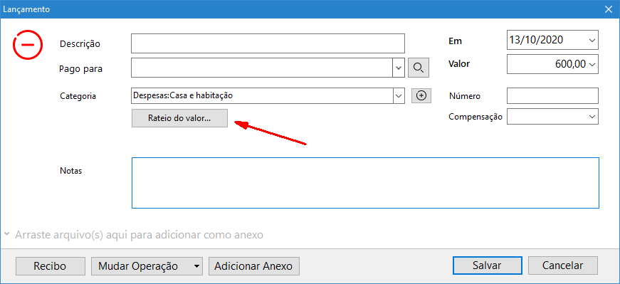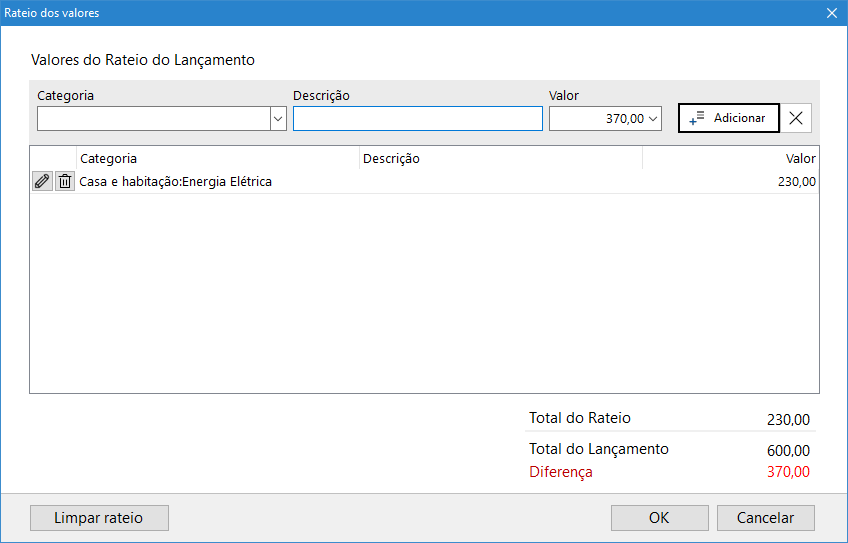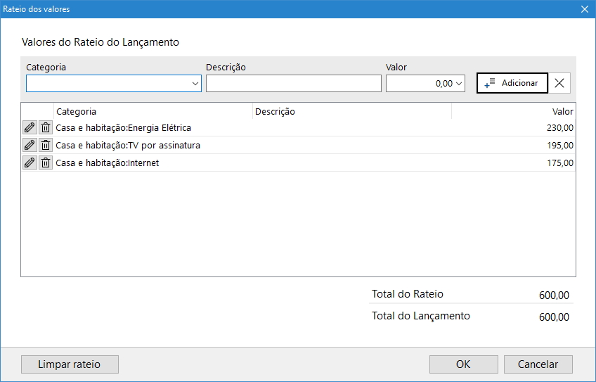 É possível ratear um lançamento, distribuindo um determinado valor em várias Categorias. Por exemplo, digamos que você utilizou um cheque para pagar mais de uma conta, como energia elétrica, internet e TV por assinatura.