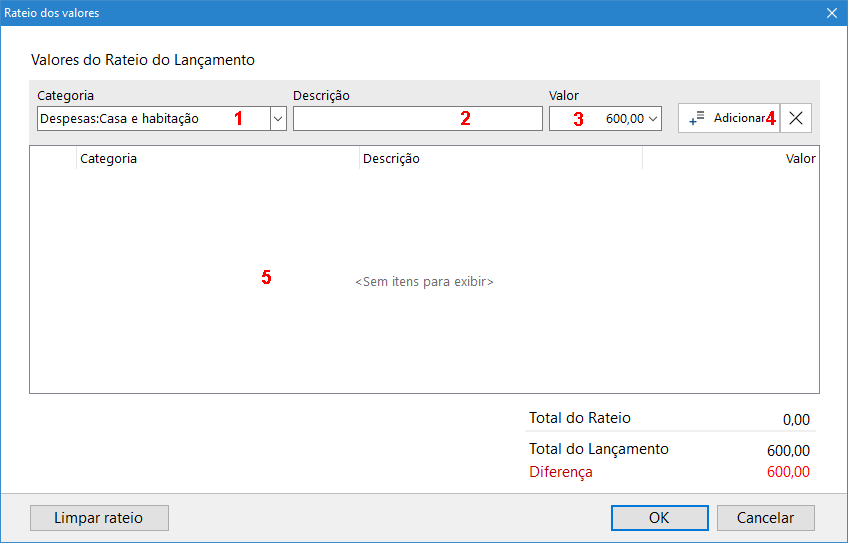 Informe então as informações necessárias como a categoria(1) e a descrição(2) do rateio.