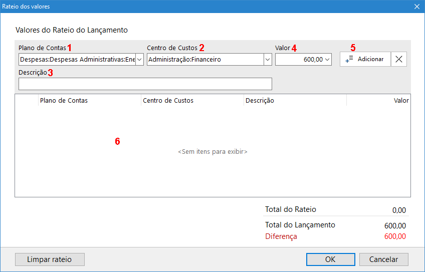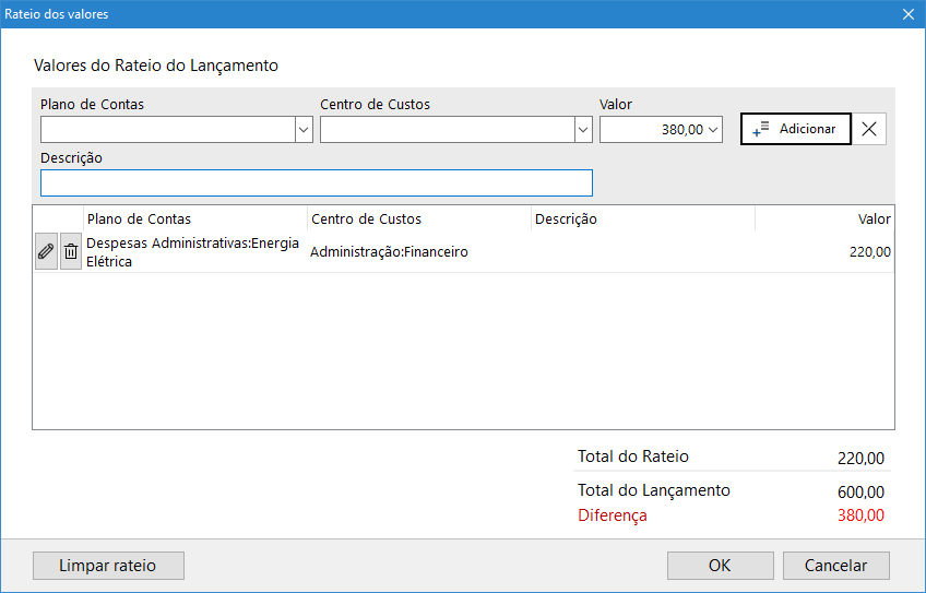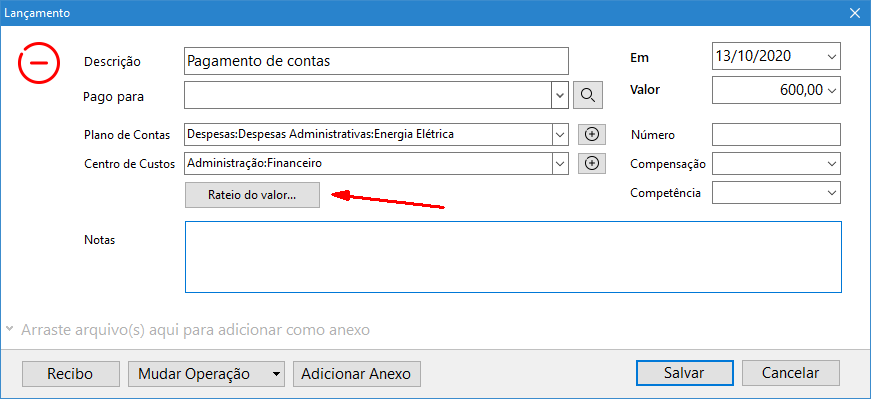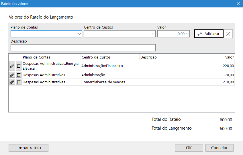 É possível ratear um lançamento, distribuindo um determinado valor em vários Planos de Contas e Centros de Custos. Por exemplo, digamos que você utilizou um cheque para pagar mais de uma conta, como energia elétrica, água e telefone.