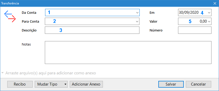 Informe os detalhes da transferência, com a conta de origem(1) e a conta de destino(2). Entre com uma descrição(3), a data(4) e o valor (5) transferido. Opcionalmente pode informar um número e também observações adicionais em notas.