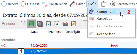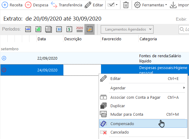 Também é possível marcar utilizando o menu de contexto, clicando com o botão direito do mouse sobre o lançamento.