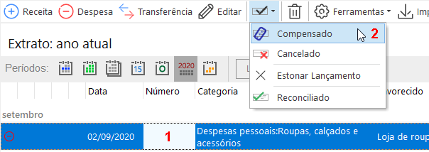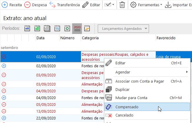 Também é possível marcar utilizando o menu de contexto, clicando com o botão direito do mouse sobre o lançamento.