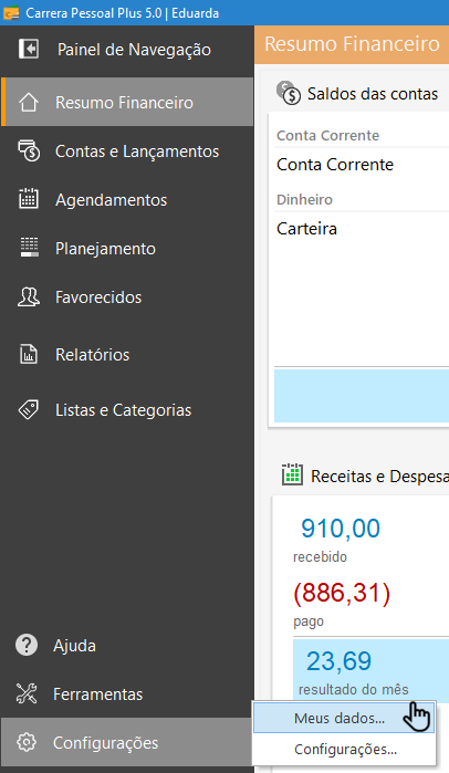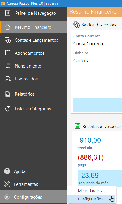 A partir do Menu da Aplicação é possível acessar a janela de configurações do Carrera. Nela é possível configurar a moeda principal, ou ainda, a confirmação de algumas mensagens, entre outros.