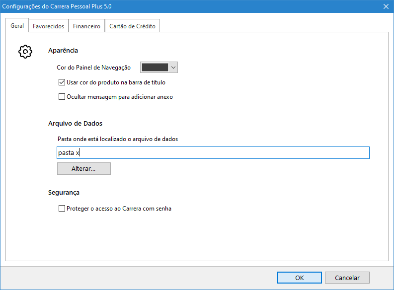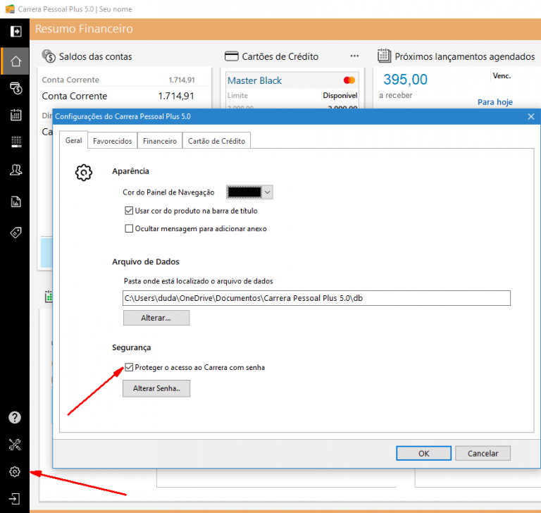 Para atribuir uma senha, basta ir em Configurações e depois mascar a caixa Proteger o acesso ao Carrera Pessoal com Senha, conforme imagem abaixo: