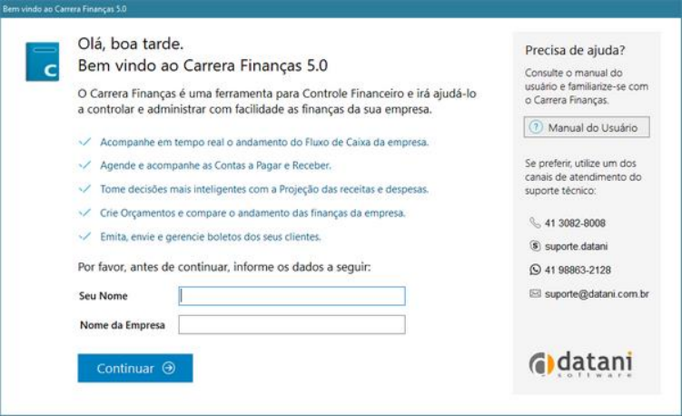 Após ser instalado e executado pela primeira vez, o Carrera apresenta uma janela de Boas vindas para você preencher Seu Nome, o Nome da Empresa.Ao prosseguir, clicando em Continuar, será iniciado o Carrera Finanças.