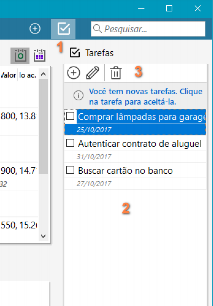 Este painel é composto por uma lista(2) com as tarefas em aberto e uma barra de ferramentas(3) para criar, editar ou apagar tarefas.